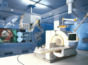 | شکل ۲۱.۱ دستگاه MRI حین عمل در یک اتاق با محافظ مغناطیسی و اجزای یکپارچه قرار دارد که امکان کارایی گردش کار را فراهم میکند. بیمار برای جراحی روی تختی خارج از خط ۵-گاوس دراز میکشد، سپس برای حفظ استریل بودن، پوشانده میشود و برای تصویربرداری در فواصل زمانی در طول عمل، به داخل اسکنر MRI چرخانده میشود. |