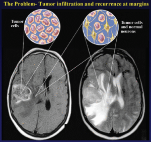 گلیوبلاستوماها تهاجمیترین تومورهای مغزی هستند. درمان آنها نیز باید تهاجمی باشد و شامل تلاش معناداری برای برداشتن جراحی رادیکال و به دنبال آن رادیوتراپی و شیمیدرمانی کل مغز در بیمارانی باشد که قادر به تحمل آن هستند. لاکروا و همکارانش در MDACC نشان دادند که بیشترین تأثیر مثبت بر بقا پس از برداشتن ≥98٪ از قسمت افزایشدهنده کنتراست ضایعه رخ میدهد. با این حال، افزایش سود در تمام درصدهای برداشتن بالای 90٪ مشاهده شد. بنابراین، اگر قرار است رزکسیون انجام شود، برداشتن کمتر از ۹۰٪ از این تومورها منطقی نیست و رویکرد ایدهآل، برداشتن کامل رادیوگرافی است. از آنجایی که این تومورها دارای لبه نفوذی هستند و از طریق بیوپسی مغز که از نظر تئوری تحت تأثیر قرار نگرفته است، نشان داده شده است که سلولهای نفوذی تا ۴ سانتیمتر از لبه رادیوگرافی تومور وجود دارد، رزکسیون “کل ناخالص” به هیچ وجه کامل نیست. به همین دلیل، باید از درمانهای کمکی استفاده شود و باید تأثیر معنادارتری بر این بیماری داشته باشد. در حوزه شیمیدرمانی، بیشترین داروهای مورد مطالعه نیتروزورهها (BCNU و CCNU آنالوگ آن) هستند که ۱۰٪ افزایش در بقای ۱۸ ماهه و تغییر کمی در میانگین بقا ایجاد میکنند. با تموزولومید و ترکیبات چند دارویی جدیدتر، میانگین بقا در موسسه ما ۲۱ ماه است. این به طور قابل توجهی بهتر از ۹ تا ۱۲ ماه بقا است که در اکثر کتابهای درسی ذکر شده است، اما هنوز هم برای بیماری که در اوج زندگی به این تومور مبتلا شده است، بسیار کوتاه است، همانطور که بسیاری از افراد در اوج زندگی خود هستند.