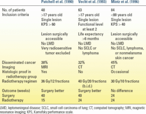 پچل و همکاران (1998) یک کارآزمایی تصادفی را توصیف کردند که بیماران جراحی را به دو گروه تحت نظر پس از عمل و رادیوتراپی تقسیم میکرد. این مطالعه محدود به بیمارانی بود که یک متاستاز مغزی کاملاً برداشته شده داشتند و پرتودرمانی شامل ۵۰.۴ گری در ۲۸ جلسه بود، که دوره درمانی به طور قابل توجهی طولانیتری نسبت به اکثر مراکز است. این رژیم درمانی، میزان عود موضعی را از ۴۶٪ به ۱۰٪ و ظهور متاستاز مغزی در مکانهای جدید را از ۳۷٪ به ۱۴٪ کاهش داد. تفاوت در بقای کلی و بقای مستقل از نظر عملکردی از نظر آماری معنیدار نبود.