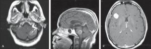 | شکل ۲۱.۳ الف: ام آر آی نشان دهنده متاستاز ناشی از کارسینوم روده بزرگ در نیمکره مخچه چپ. این بیمار باید تحت عمل جراحی قرار گیرد، زیرا اندازه ضایعه آن را کمی بالاتر از حد ۳ سانتی متر برای رادیوجراحی استریوتاکتیک قرار میدهد و محل آن در حفره خلفی به این معنی است که ساقه مغز باید از احتمال ادم پس از پرتودرمانی محافظت شود. ب: این کارسینوم متاستاتیک با منشا ناشناخته در ساقه مغز قرار دارد، محلی که برای جراحی ناامن است. باید با رادیوجراحی استریوتاکتیک درمان شود. ج: این متاستاز کوچک ناشی از کارسینوم سلول کلیوی در لوب پیشانی راست قرار دارد. این ناحیه برای جراحی و رادیوجراحی ایمن است و این بیمار میتواند هر دو درمان را دریافت کند، و انتخاب یکی بر دیگری مزیت کمی دارد. |