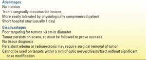 در یک روز انجام میشوند و به بهبودی پس از درمان کمی نیاز دارند یا اصلاً نیازی ندارند. آنها نیاز به قرار دادن قاب سر دارند که منجر به ناراحتی متوسط میشود، اما اکثر بیماران این را به خوبی تحمل میکنند. مقایسه گذشتهنگر حاکی از نتیجه مشابه بین جراحی و تابش استریوتاکتیک است، اما به دلیل سوگیری انتخاب، غیرقابل اعتماد است. مقایسه آیندهنگر نشان داده است که برداشتن تومور، میزان عود موضعی کمتری نسبت به رادیوسرجری دارد، اما اثرات نسبی آنها بر بقا کمتر مشخص است. مزایا و معایب رادیوسرجری در جدول 21.5 نشان داده شده است. در MDACC، اکنون به ازای هر بیمار که با جراحی درمان میشود، پنج بیمار با رادیوسرجری درمان میشوند.