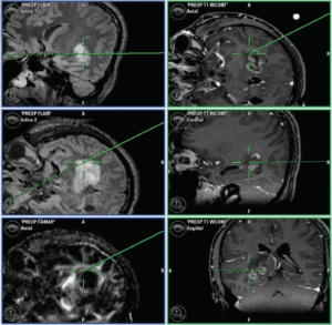 معمولاً تصاویر قبل از عمل و پس از قرار دادن نشانگرهای ثابت روی پوست نیمه قدامی سر، گرفته میشوند. تصاویر گرفته شده به ایستگاه کاری کامپیوتر حین عمل منتقل میشوند و میتوانند روی دادههای تصویربرداری از MRI عملکردی یا تراکتوگرافی قرار گیرند تا مرزهای آناتومیکی که برداشتن تومور را محدود میکنند، همانطور که در بالا ذکر شد، شناسایی شوند و در نتیجه خطر آسیب عصبی کاهش یابد. وقتی بیمار در اتاق عمل در وضعیت نهایی قرار میگیرد، ثبت انجام میشود تا آرایه فیدوسیال بیمار با آرایه نشان داده شده در تصاویر قبلی هماهنگ شود. از آن نقطه به بعد، جراح میتواند موقعیت هر نقطهای در سر را به صورت سهبعدی نسبت به تومور یا نسبت به نشانههای آناتومیک با دقت ۱ تا ۲ میلیمتر بررسی کند. با این حال، این دقت با پیشرفت عمل به دلیل جابجایی مغز ناشی از هیپرونتیلاسیون، از دست دادن مایع مغزی نخاعی و برداشتن تومور کاهش مییابد. بنابراین، ما معمولاً از سونوگرافی حین عمل برای تصویربرداری در زمان واقعی استفاده میکنیم، زیرا ارزانتر است، بازخورد فوری ارائه میدهد و در معرض فراز و نشیبهای جابجایی مغز قرار نمیگیرد.
