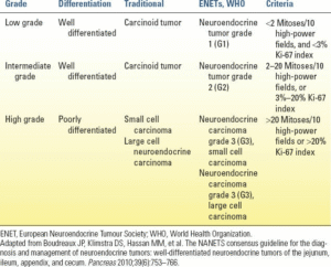 در تلاش برای استانداردسازی اصطلاحات، انجمن تومور نورواندوکرین اروپا (ENETS) و سازمان بهداشت جهانی معیارهایی را تعیین کردند تا اطمینان حاصل شود که پزشکان به یک زیرگروه تومور اشاره میکنند. بر اساس این معیارها، تومورهای کارسینوئیدی روده کوچک بر اساس تعداد میتوز و شاخص تکثیر Ki-67 به سه درجه تقسیم میشوند (جدول 10.2).