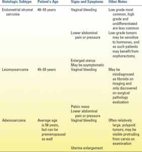 سارکومهای رحم از مشتقات مزودرمی ناشی میشوند که شامل عضله صاف رحم، استرومای آندومتر و دیوارههای رگهای خونی و لنفاوی هستند. تعداد میتوزها در هر 10 میدان با بزرگنمایی بالا، درجه آتیپی سیتولوژیک و وجود نکروز انعقادی، قابل اعتمادترین پیشبینیکنندههای رفتار بیولوژیکی هستند. این بیماری بر اساس نوع عناصر درگیر (خالص، فقط عناصر مزودرمی وجود دارند و مختلط، هم عناصر مزودرمی و هم اپیتلیال وجود دارند) و اینکه آیا عناصر مزودرمی بدخیم به طور معمول در رحم وجود دارند یا خیر (همولوگ، فقط عضله صاف و استروما وجود دارند و هترولوگ، عضله مخطط و غضروف وجود دارند) طبقهبندی میشود. شایعترین زیرگروههای بافتشناسی، لیومیوسارکومها (تقریباً 60٪) و سارکومهای استرومایی آندومتر (تا 20٪) هستند. زیرگروههای کمتر رایج، آدنوسارکومها، سارکومهای هترولوگ خالص و سایر انواع هستند.