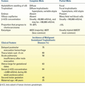 مول هیداتیفورم. خونریزی واژینال، اندازه رحم بزرگتر از حد انتظار برای سن حاملگی، و وجود کیستهای برجسته تخمدان تکالوتئین از ویژگیهای بالینی مشخصه مول هیداتیفورم هستند. ویژگیهای مول هیداتیفورم جزئی و کامل در جدول 20.19 فهرست شده است. سایر یافتههای مرتبط شامل توکسمی، استفراغ شدید، پرکاری تیروئید و علائم تنفسی مانند تنگی نفس و دیسترس تنفسی است. بیماران مبتلا به مولهای جزئی ممکن است به همان شیوهای که افراد مبتلا به سقط جنین از دست رفته یا ناقص دارند، تظاهر کنند: خونریزی واژینال و عبور بافت از واژن.