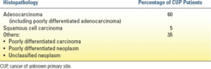 میانگین بقای بیماران مبتلا به CUP 6 تا 9 ماه است. زیرگروههای خاصی از بیماران مبتلا به CUP متاستاتیک، مانند کسانی که میتوانند با درمان مناسب درمان شوند، پیشآگهی به طور قابل توجهی بهتری نسبت به کل گروه دارند. این گروه مطلوب شامل بیماران مبتلا به سرطان سلول سنگفرشی متاستاتیک به غدد لنفاوی گردن، زنان مبتلا به آدنوکارسینوم متاستاتیک در غدد لنفاوی زیر بغل، مردان مبتلا به سرطان تمایز نیافته و سطح بالای β-hCG یا α-fetoprotein (AFP)، زنان مبتلا به کارسینوماتوز صفاقی و بیماران مبتلا به CUP نورواندوکرین است. این زیرگروهها بعداً در این فصل با جزئیات بیشتری مورد بحث قرار میگیرند.