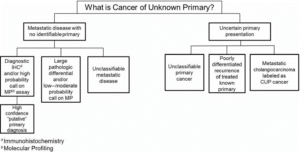 CUP با وجود یک سرطان اثبات شده با بیوپسی تعریف میشود که منشأ آناتومیکی تومور اولیه پس از شرح حال کامل و معاینه فیزیکی مشخص نمیشود. فرضیه غالب در CUP این است که تومور اولیه یا میکروسکوپی باقی میماند و از تشخیص بالینی فرار میکند یا پس از ایجاد متاستاز ناپدید میشود، که ممکن است به دلیل بیکفایتی رگزایی تومور اولیه باشد.