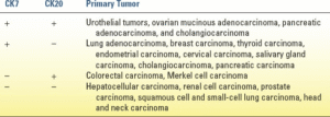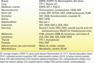آنالیزهای ایمونوهیستوشیمی به یک روش معمول برای میکروسکوپ نوری تبدیل شدهاند و طیف گستردهای از نشانگرهای ایمونوهیستوشیمی برای کمک به تشخیص پس از میکروسکوپ نوری استفاده میشوند. نشانگرهای رایج مورد استفاده برای آدنوکارسینومها شامل فاکتور رونویسی تیروئید (TTF-1) و سیتوکراتینهای (CK) 7 و 20 هستند. TTF-1، یک پروتئین هستهای، میتواند در سرطانهای ریه و تیروئید مثبت باشد. حدود 65 تا 70 درصد از آدنوکارسینومهای ریه و 25 درصد از سرطانهای ریه سلول سنگفرشی برای TTF-1 مثبت هستند و در بیماران مبتلا به CUP، این آزمایش در تمایز بین تومور اولیه ریه و آدنوکارسینوم متاستاتیک (به عنوان مثال، در بیمارانی که با افیوژن پلور متاستاتیک مراجعه میکنند) مفید است. الگوی ترکیبی نشانگر CK که در جدول 22.2 نشان داده شده است نیز مفید است. نشانگرهای پستان شامل گیرنده استروژن (ER)، گیرنده پروژسترون (PR)، Her-2/neu و پروتئین فیبروز بیماری کیستیک ناخالص باید در زنانی که با آدنوکارسینوم، به ویژه آدنوپاتی زیر بغل ایزوله مراجعه میکنند، بررسی شوند. Hep-par-1، یک نشانگر کارسینوم هپاتوسلولار، به تشخیص سرطان هپاتوسلولار کمک میکند و CK-19 گاهی اوقات برای کلانژیوکارسینوما استفاده میشود. تشخیص کلانژیوکارسینومای متاستاتیک، آدنوکارسینوم متاستاتیک و کارسینوم هپاتوسلولار در بیمارانی که با بیماری متاستاتیک فقط کبدی مراجعه میکنند، میتواند دشوار باشد. سایر نشانگرهایی که به صورت هدفمند بر اساس نتایج میکروسکوپی گذشته استفاده میشوند عبارتند از: اسید فسفاتاز پروستات و PSA برای سرطان پروستات و انولاز اختصاصی نورون و کروموگرانین برای سرطانهای نورواندوکرین. تومورهای سلولهای زایا اغلب برای β-hCG و AFP رنگآمیزی میشوند.