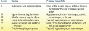 گردن شامل بیش از 25 حوضه گرهی است. این گرهها برای استانداردسازی ارزیابی پاتولوژیک بیماران به شش دسته خاص گروهبندی شدهاند. طبقهبندی غدد لنفاوی گردن در جدول 22.4 نشان داده شده است. شایعترین محل متاستاز در بیماران مبتلا به سرطان سلول سنگفرشی سر و گردن، غدد لنفاوی ژوگولودیگاستریک یا سطح II زنجیره ژوگولار داخلی فوقانی و پس از آن غدد لنفاوی میان ژوگولار یا سطح III است.