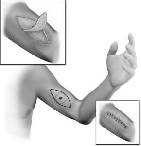 | شکل ۳.۱ برش وسیع ملانوما. حاشیه شعاعی مناسب به صورت شماتیک (تصویر مرکزی، خط نقطهچین خاکستری روشن) به همراه برش بیضوی با جهتگیری محوری مناسب برای تسهیل بسته شدن اولیه (تصویر داخلی، پایین سمت راست) پس از برش وسیع (تصویر داخلی، بالا سمت چپ) (با تشکر از Gershenwald JE، هوستون، تگزاس. حق چاپ محفوظ است برای Gershenwald و مرکز سرطان دانشگاه تگزاس MD Anderson). |